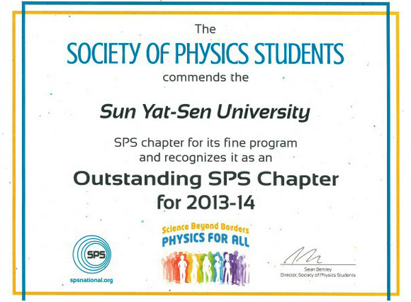 近日,美國大學生物理聯合會(Society of Physics Students)公布了2013-2014年度評選結果,中山大學分會(SPS-SYSU)獲得最高榮譽,與加州大學伯克利分校等全球頂尖高校分會同被評為杰出(outstanding)分會,成為亞洲地區唯一獲此殊榮的分會。我校是國內第二所加入該組織的高校,成立第一年就獲評全球前20%優秀(distinguished)分會。