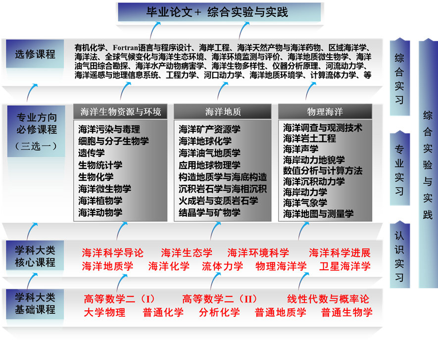 “專業方向”板塊包括“海洋生物資源與環境+海洋地質+物理海洋”。專業方向必修課是反映該方向最基本、原理性的專業知識體系,體現專業基本面貌。本培養方案設置海洋生物資源與環境、海洋地質學、物理海洋學3個專業方向,學生通過專業方向必修課程學習,系統掌握各方向基本研究原理和方法,為專業綜合提升建立基礎。其中,海洋生物資源與環境方向包括:海洋動物學、海洋植物學、生物化學、海洋微生物學、生物統計學、遺傳學、海洋污染與毒理、細胞與分子生物學。海洋地質學方向包括:結晶學與礦物學、火成巖與變質巖石學、沉積巖石學與海相沉積、構造地質學與海底構造、應用地球物理學、海洋油氣地質學、海洋地球化學、海洋礦產資源學。物理海洋學(海岸工程)方向包括:海洋地圖與測量學、海洋氣象學、海岸動力學、海洋沉積動力學、數值分析與計算方法、海岸動力地貌學、海洋聲學、海洋巖土工程、海洋調查與觀測技術。