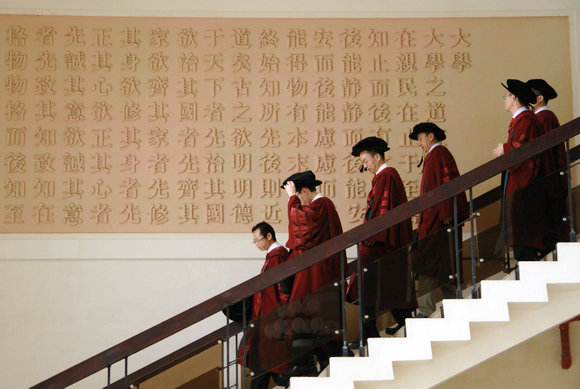 當(dāng)入場(chǎng)音樂響起,梁銶琚堂頓時(shí)肅穆起來,在舞臺(tái)燈光及神奇特效的映照下,整個(gè)禮堂熠熠生輝。教授手執(zhí)權(quán)杖緩步入場(chǎng),全場(chǎng)起立,注目行禮。舞臺(tái)的左側(cè),銀色權(quán)杖輝映著儀式的莊嚴(yán)和神圣。身著學(xué)位袍的學(xué)子們,在權(quán)杖的見證下,從校長手中接過畢業(yè)紀(jì)念冊(cè)。校歌奏響,宣布禮成。在這個(gè)每年如期而至的畢業(yè)季,2015屆畢業(yè)典禮暨2015年學(xué)位授予儀式正在有條不紊地進(jìn)行著。