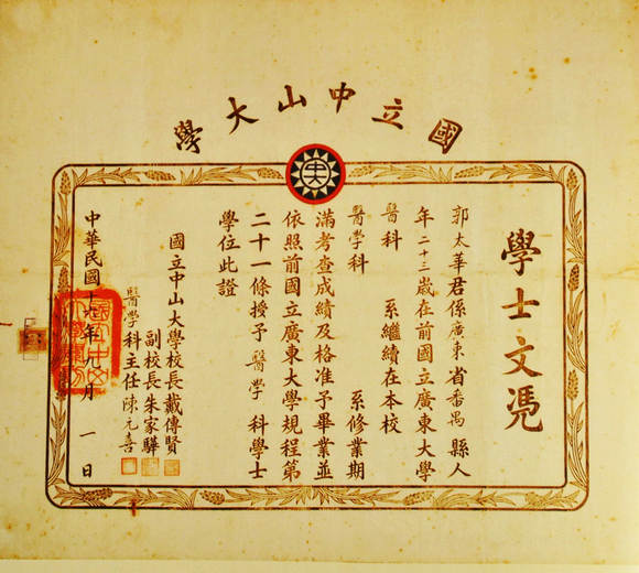 1927年,國立中山大學(xué)有了自己的第一屆畢業(yè)生,也由此誕生了第一批學(xué)位證書。這張證書于1927年9月1日由校長戴傳賢(戴季陶)、副校長朱家驊簽署頒發(fā),寬46.1厘米,長53.3厘米。中山大學(xué)初成立時(shí)的名稱為國立廣東大學(xué),為了紀(jì)念孫中山先生,于1926年改名為國立中山大學(xué)。因此,畢業(yè)證上也寫得很清楚,畢業(yè)生是在“前國立廣東大學(xué)”入校,甚至依照的規(guī)程也是“前國立廣東大學(xué)”的。這張學(xué)位證記錄著中大的崢嶸歲月。