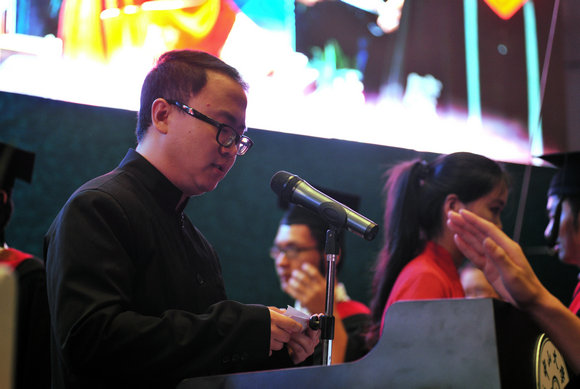 來自資訊管理學(xué)院2012級的李林峰便是司儀中的一員,朗誦學(xué)位獲得者的名字看似簡單,實則很難,為了感染同學(xué)們,讓這個神圣的時刻更完美,司儀們“要有感情,有共鳴,還要帶著微笑,要求很嚴(yán)格。” 來自中大附屬第一醫(yī)院的神經(jīng)科碩士譚帥是李林峰的好友,也是畢業(yè)典禮的司儀,這是他第一次參加畢業(yè)典禮。“我感到很榮幸?!碧岬綄Ξ厴I(yè)典禮的感受,譚帥自豪地說,“我一些在國外留學(xué)的同學(xué)都說我們的畢業(yè)典禮跟英國的劍橋、牛津很像?!?br />