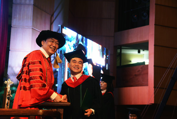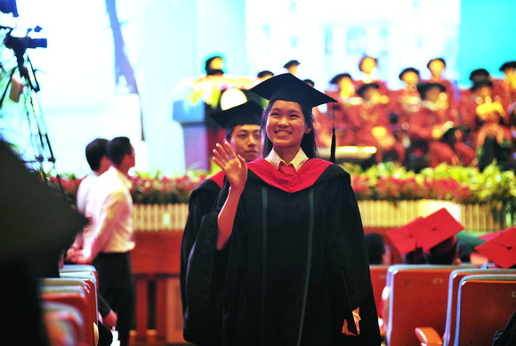 嶺南學(xué)院碩士畢業(yè)生居年余上臺和校長握手時,臺下傳來熱烈的歡呼聲,這位高人氣的畢業(yè)生原來是2010級本科生輔導(dǎo)員,正巧今天和同學(xué)們一起畢業(yè)。與2010級學(xué)弟學(xué)妹在珠海一起度過的兩年時間里,居年余和同學(xué)們建立了深厚的感情,“他們就像自己帶大的孩子,今天他們畢業(yè)了,我心情很復(fù)雜,同時也覺得很幸福、很光榮?!?br />