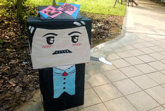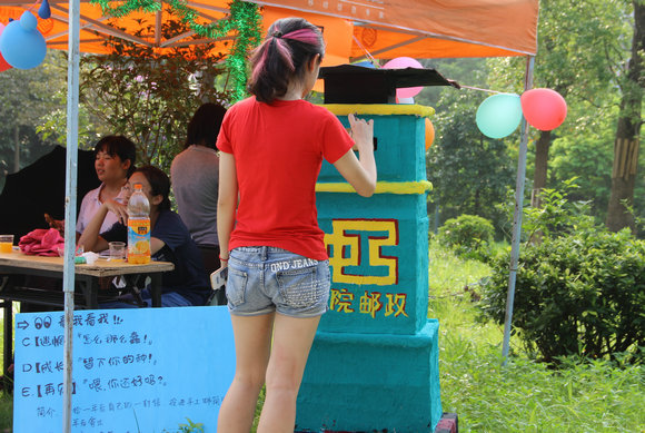 “時光囊”郵筒、工學院辦公大樓模型更吸引了不少畢業(yè)生,他們紛紛前來合影留念?!皶r光囊”郵筒由4名學生共同完成,他們利用4個大小不一的廢舊紙箱,上下排列成郵筒形狀,外圍用紙巾包裹,再用熒光筆一點點給“郵筒”著色,并充滿創(chuàng)意地給它“戴上”了學位帽;工學院辦公大樓模型是利用9只大小不一的廢紙箱,由9名學生連續(xù)工作約9小時才得以完成。此外,嘉年華現場還隨處可見各種手工制作的指路箱、指引牌。一件件手工制品,都是師弟師妹們用汗水凝聚的對師兄師姐們的最真誠而質樸的送別與祝福。