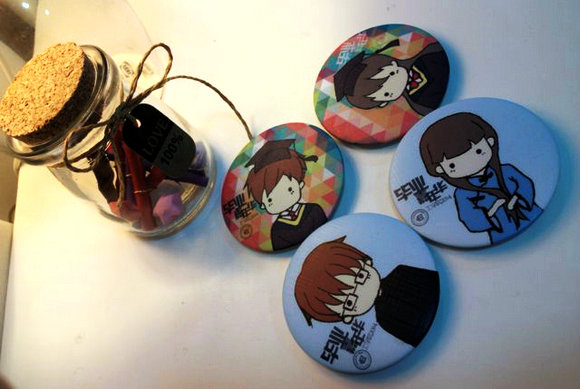 派發(fā)的傳單、邀請函都是師弟師妹們手繪而成,邀請函上每一位畢業(yè)生的名字也都是他們一筆一劃寫下的。而畢業(yè)徽章一套共四枚,每枚都有“畢業(yè)嘉年華”字樣和工學院院徽,一對的主元素是身著學位服、頭戴學士帽的學院stlye動漫人物,另一對的是分別身著中山裝和襖裙的民國style,這正是校園中隨處可見的畢業(yè)生們最常見的裝束。原來,畢業(yè)徽章都是根據2013級生物醫(yī)學工程專業(yè)王瑛姝婷同學的手繪樣圖制作而成,她整整花了一天時間進行創(chuàng)作。在畢業(yè)生中有很多相處很好的師兄師姐,她希望“他們看到徽章的時候能夠喜歡”。
