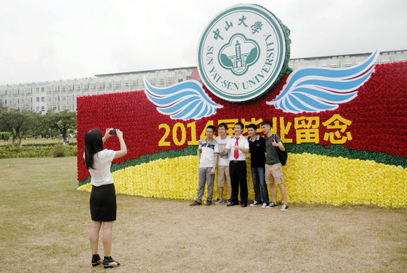 逸仙大道路旁,上百張2014屆畢業生舊照展板貼滿了道路邊的宣傳欄,他們在這里的點點滴滴如剪影映入眼簾,是對他們大學生活的總結、自我成長的勉勵,也是對即將離開母校的留戀和懷念。“亞洲第一長教學樓”前的草坪上,豎著一面由紅、綠、黃三種顏色的花朵排列而成的畢業花墻,紅色花朵正中,嵌著“2014屆畢業留念”大字,其上展開了兩只藍色的翅膀,托起校徽。吸引了不少畢業生前往留念,“咔嚓”一聲,定格下或搞怪合照或恩愛情侶照或個性單人照……