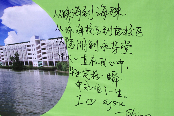 這里有對母校的愛:“嫁給中大!——小tai”“畢業(yè)了,中大,你永遠(yuǎn)在我心中。我永遠(yuǎn)是中大人!!——魏守華”