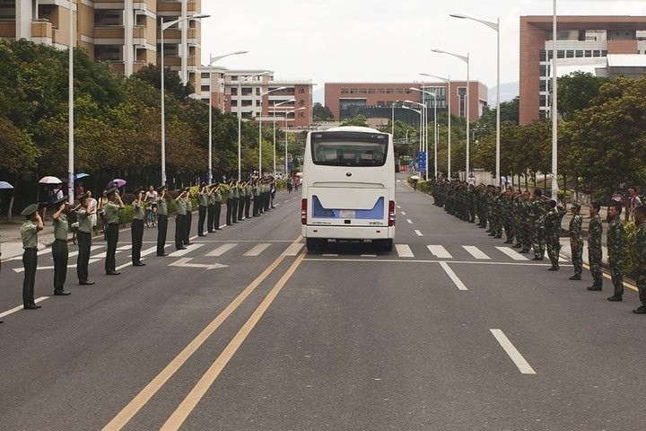 國防生送別儀式上,武警選培辦管明華主任揮手送別,離別的汽車緩緩開動,師弟們齊刷刷地列成兩隊(duì),行軍禮目送師兄們離開。這一刻,好多平素剛毅的漢子,回憶起大學(xué)期間的點(diǎn)滴情懷,都忍不住流下男兒淚。