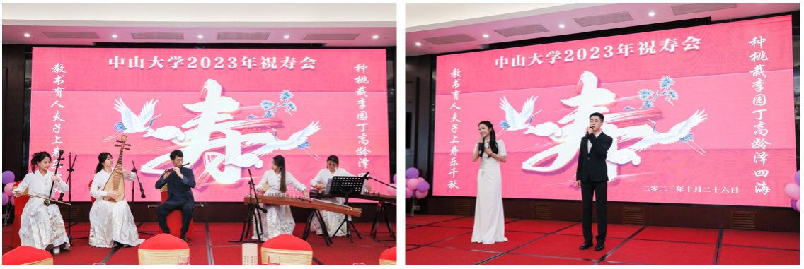 伴隨著歡快的《生日歌》旋律,陳春聲書記、高松校長及四位百歲老人夏書章、李哲、龍婉云、李寶娣老前輩一起共切蛋糕、分享幸福美好時刻。藝術學院學生為老人家們帶來民樂合奏《彩云追月》和《花好月圓》,用音樂表達年輕學生對長者團圓幸福、健康長壽的美好祝愿;最后以一曲《我愛你中國》表達對祖國母親的深情與祝福。