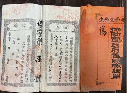 1911年辛亥革命爆發后,嶺南學堂學生組織“籌餉隊”為廣東軍政府募捐,共募得5萬余元餉款。這是1911年12月21日嶺南學堂學生籌餉隊募捐收單以及籌餉隊印章。