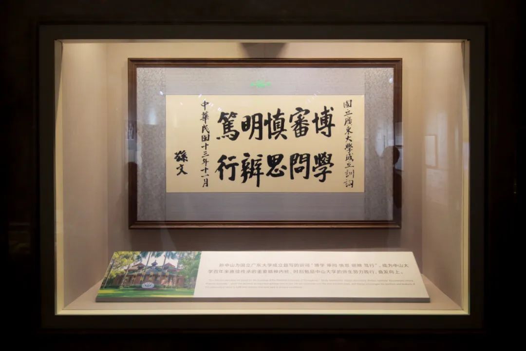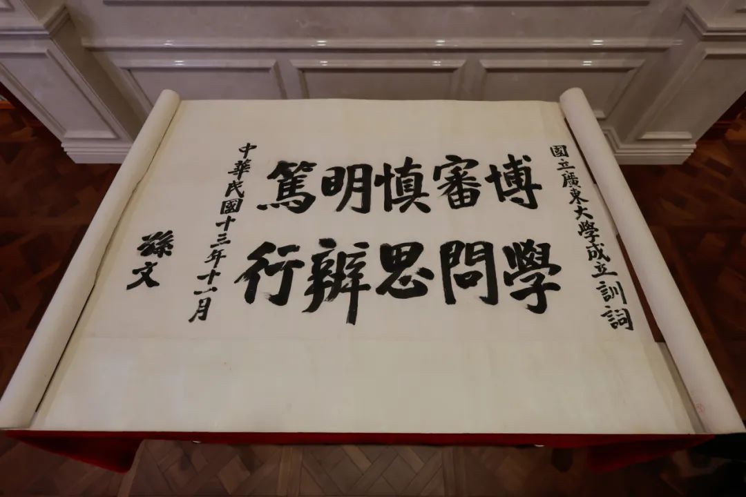 1924年在11月11日,國立廣東大學舉行成立典禮,由于應馮玉祥之邀北上,孫中山先生未親臨成立典禮講話,但為成立典禮親筆題寫了“博學 審問 慎思 明辨 篤行”十字訓詞。