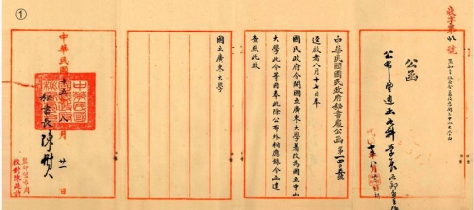 1926年8月17日,國民政府秘書處關于將國立廣東大學改名為國立中山大學的公函
