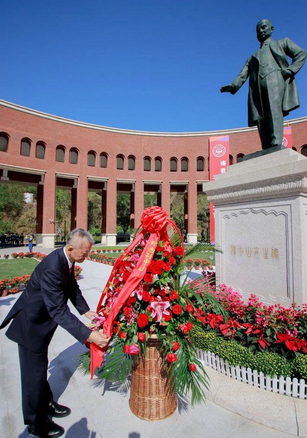 12日上午,廣州校區南校園、東校園、北校園及珠海校區同時舉行校慶日向孫中山銅像獻花儀式,向孫中山先生致敬。