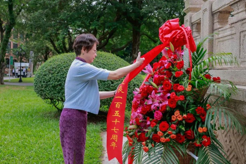 升旗儀式后,敬獻花籃曲響起。國旗班同學步履鏗鏘,將花籃穩步抬至孫中山先生銅像基座前。主禮校領導緩步上前,仔細整理花籃緞帶。紅色緞帶上印著“中山大學紀念孫中山先生誕辰一百五十七周年”,凝聚著全體中大人對中山先生的深切緬懷和崇高敬意。