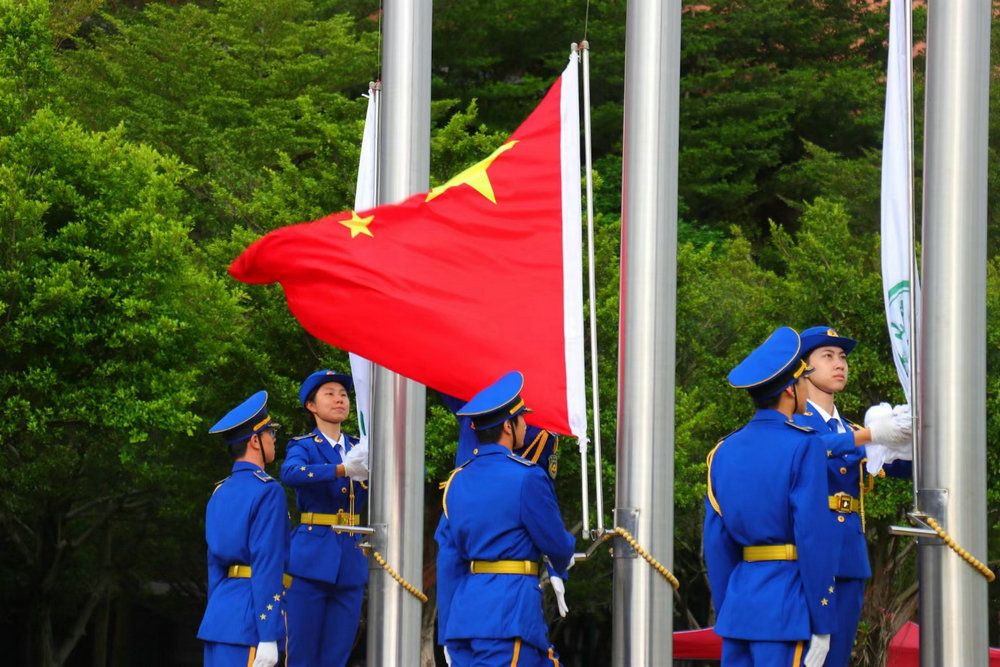 上午九時三十分,天高云淡,晨暉滿地,儀式在三校區五校園同步舉行。在莊嚴的國歌、校歌聲中,五星紅旗和中山大學校旗先后升起、迎風飄揚,在場全體師生高聲齊唱、行注目禮。