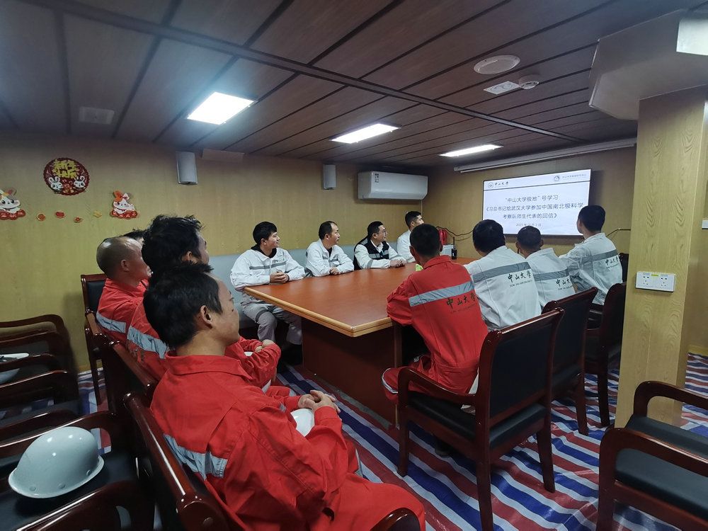 12月3日,“中山大學極地”號全體船員在舟山船廠集體學習習近平總書記給武漢大學參加中國南北極科學考察隊師生代表的回信精神。大家表示不辜負殷切囑托,共同推進極地號三期改造和設備加裝工作,為執行科學任務做好充足準備,為中山大學南北極科考保駕護航。學院在舟山參加2023年中國極地年會的師生也一同學習了回信精神。