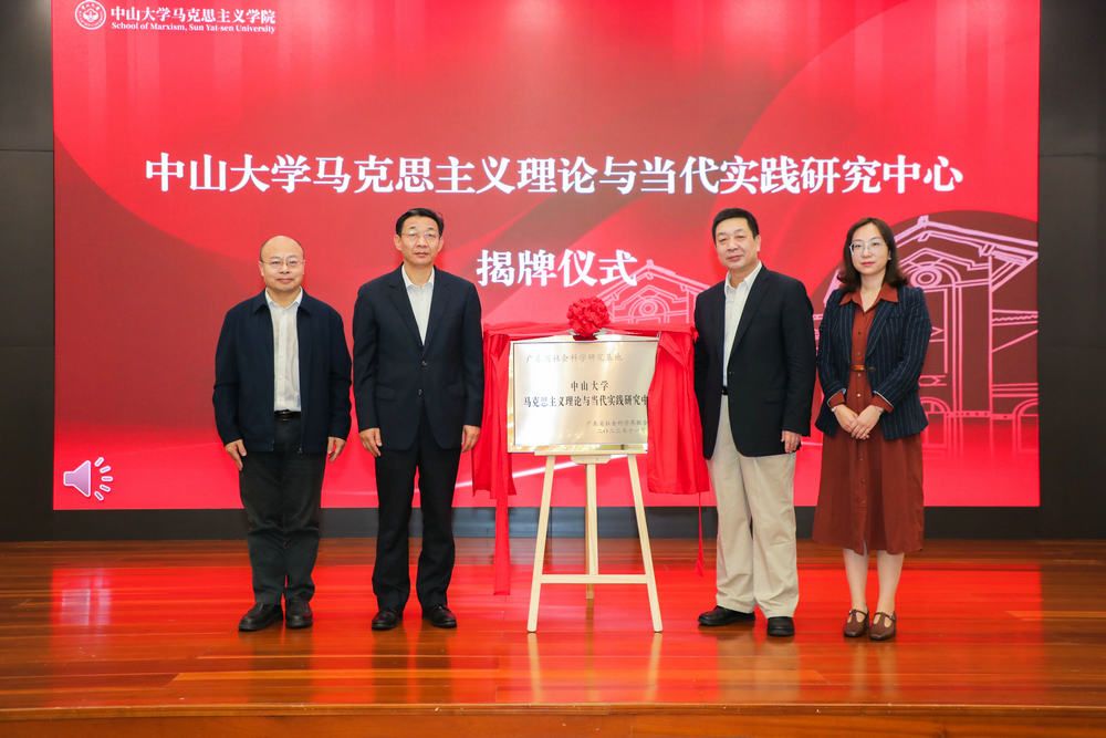 張知干書記、余敏斌副書記、中山大學馬克思主義學院院長林進平教授、中山大學人文社會科學處副處長何琬冰共同為“中山大學馬克思主義理論與當代實踐研究中心”揭牌。