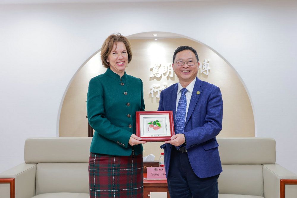 高松校長代表中山大學歡迎吳若蘭大使的到訪,并介紹了我校辦學格局、人才培養、科學研究和國際合作交流等情況。他指出,我校已與10多所英國高校在人才培養、師生交流、科研合作等領域開展了良好的合作,合作領域涉及醫學、地理、經濟、語言、化學、政務、法學、旅游學、計算機學等多個領域。我校期望與英國高校繼續加強合作與交流,共同打造開放共享的合作平臺,面向全球重大科學問題,共同推進科學前沿探索,為全球發展貢獻更多解決方案。明年是中大百年校慶,歡迎英國高校的同仁屆時來校訪問交流。