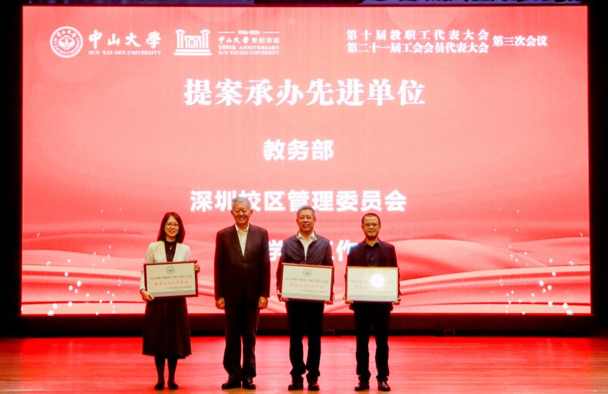 陳春聲書記為榮獲十屆二次教代會“提案承辦先進單位”教務部、深圳校區管理委員會、黨委學生工作部代表頒發獎牌(黨委宣傳部 肖遙 攝)