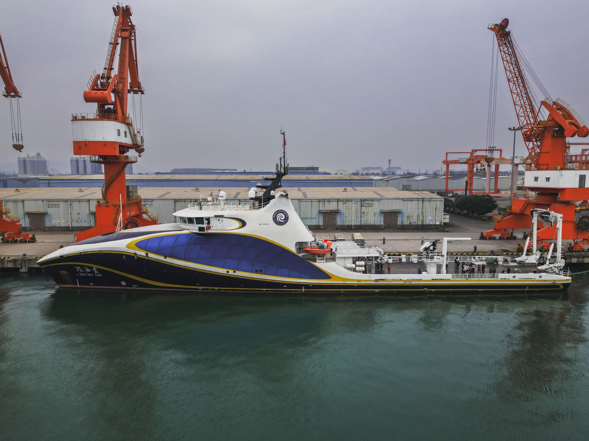 在“珠海云”號(hào)智能型無人系統(tǒng)科考母船,船長(zhǎng)和科研人員向媒體記者詳細(xì)介紹了母船的設(shè)計(jì)理念、空間設(shè)計(jì)、支持功能、航次任務(wù)和成果。母船主體設(shè)備的國(guó)產(chǎn)化率高,其建設(shè)貫徹了“綠色智能”“無人系統(tǒng)科考支持”“未來感”等設(shè)計(jì)理念。