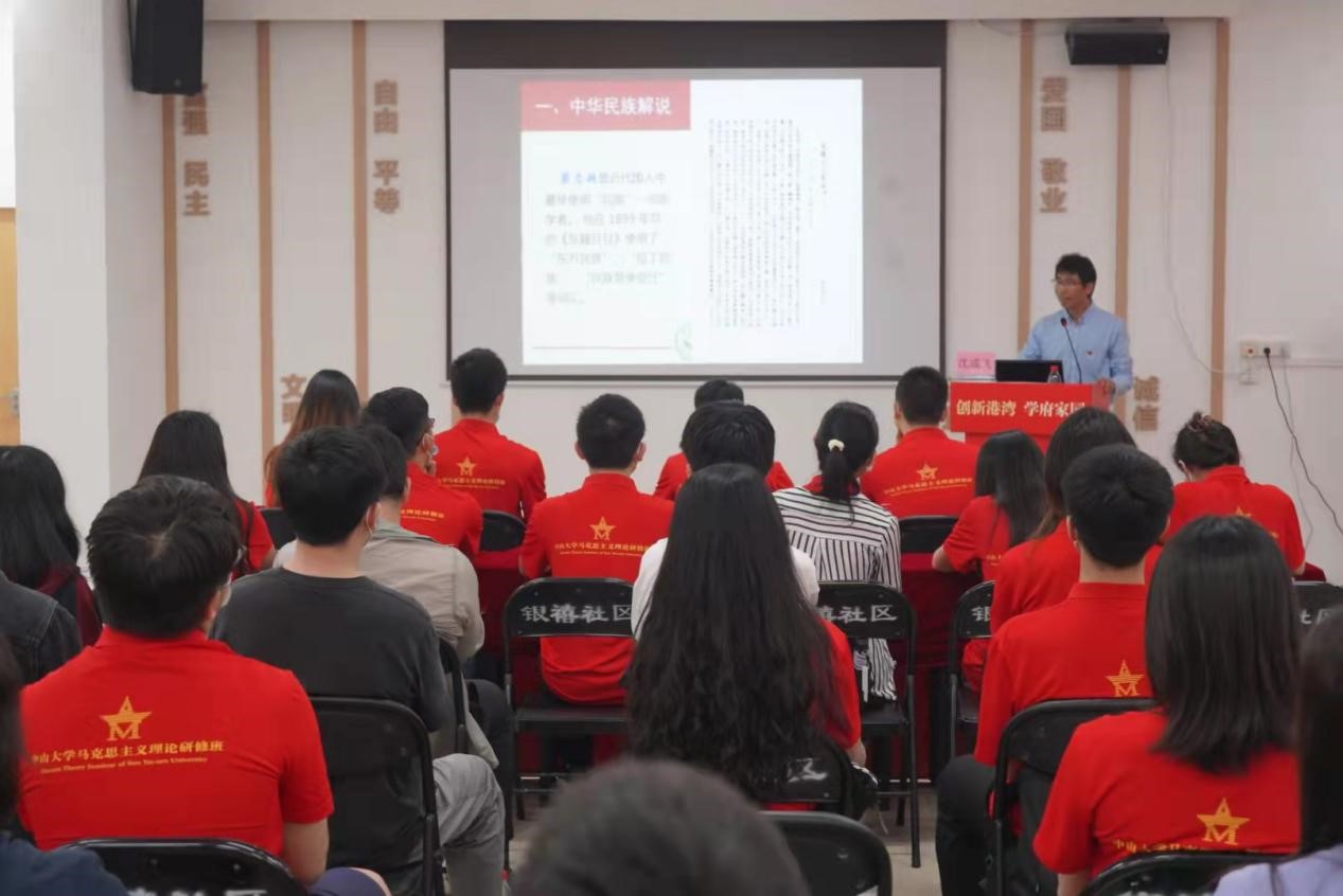 中山大學(xué)馬克思主義學(xué)院副院長沈成飛為現(xiàn)場黨員、群眾代表授課。(來源:新港街道辦事處)