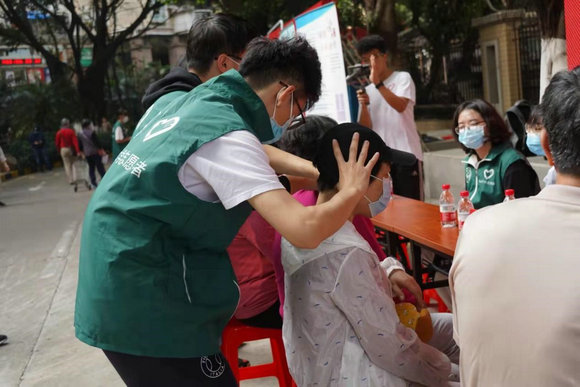 中山大學(xué)青年志愿者協(xié)會(huì)學(xué)生志愿者在為居民進(jìn)行頭部按摩。