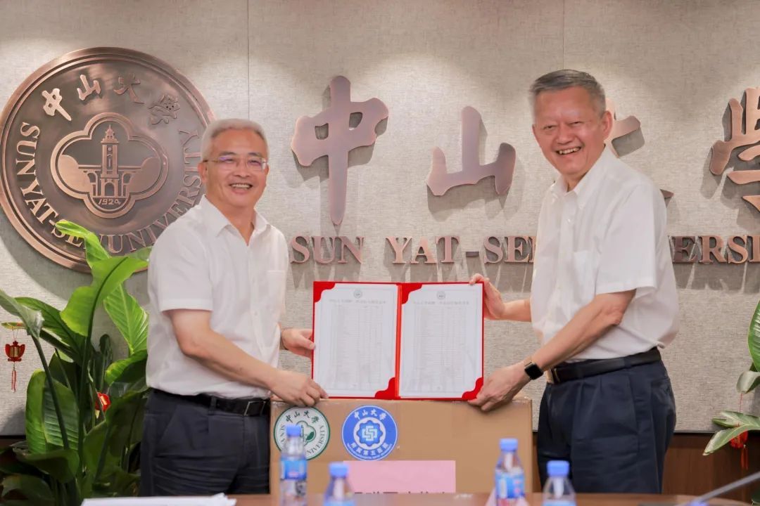 陳春聲書記和高松校長一起向三沙市贈送“中山大學”號海洋綜合科考實習船模型(來源:黨委宣傳部 李建平攝)