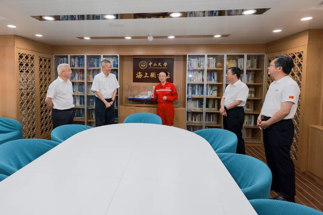隨后,校領導和三沙市領導一起考察了“中山大學”號海洋綜合科考實習船,調研海上圖書館、海上大講堂、船載科考設備,聽取科研人員有關成果的介紹。