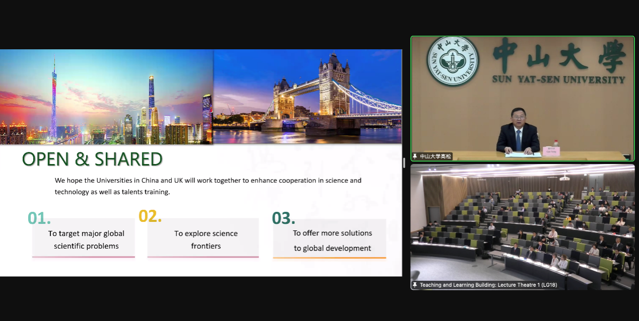 高松校長指出,中山大學地處粵港澳大灣區的改革開放發展前沿,堅持開放式辦學,注重加強國際合作。近年來,學校堅持以國家需求為導向,面向世界科技前沿、面向經濟社會需要和人民生命健康,大力建設高水平重大科技基礎設施和創新平臺,推動面向全球開放共享。學校致力于構建“學校—學部—院系”三級學術治理體系;探索校內與校外多種形式的教師聘用模式;堅持以學生成長為中心,幫助學生培養強大的學習力、思想力、行動力;并通過數字化,提升教育發展質量。高松校長表示,希望中英兩國高校一起通過重大創新平臺、學科交叉融合和教育數字化提升科技合作水平和人才培養水平,打造開放共享的合作平臺,面向全球重大科學問題,共同探索科學前沿問題,為全球發展貢獻更多解決方案,造福人類社會。