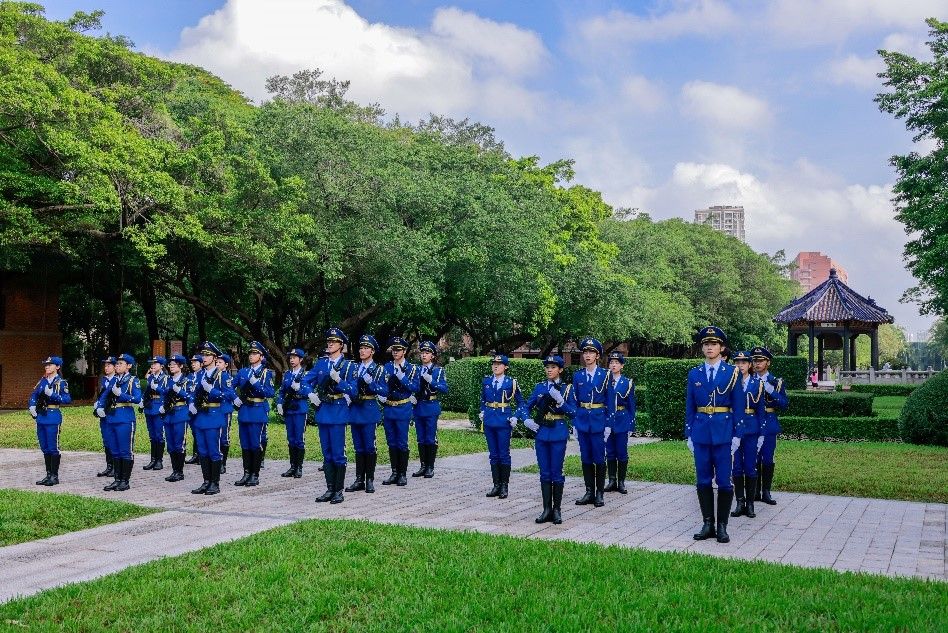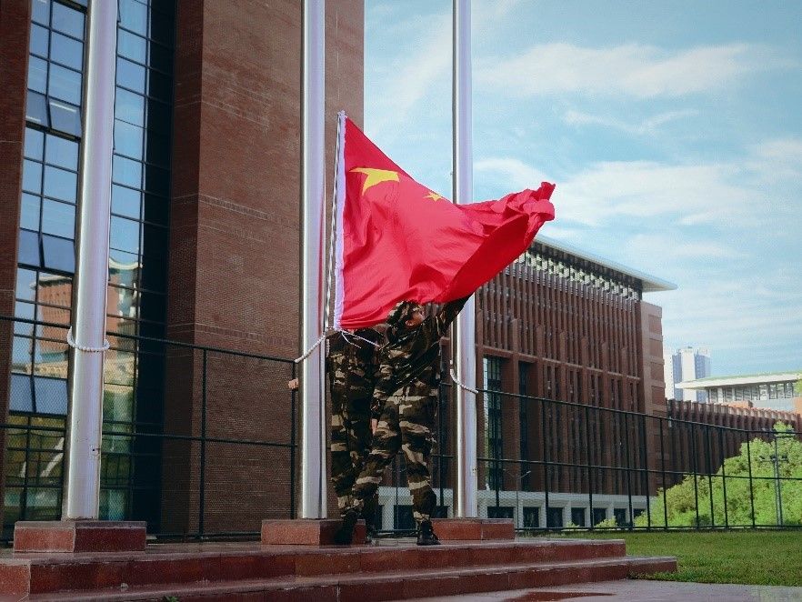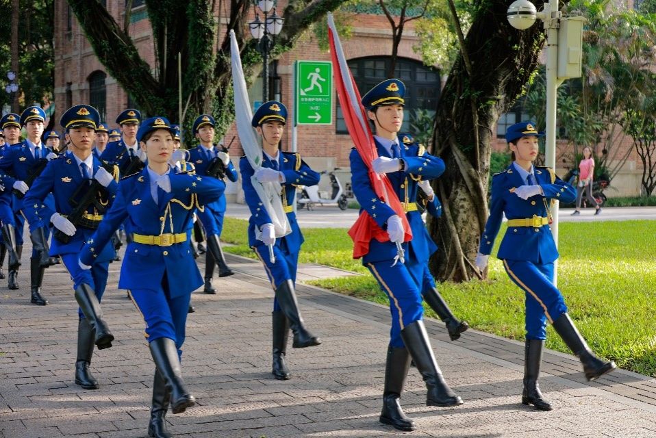 早晨8點前,國旗班成員們早已精神抖擻地在儀式現場就位。全場氣氛莊重,擎旗手肩扛五星紅旗,護旗手護送國旗緩緩前進,他們精神抖擻、步履鏗鏘。在洪亮的口令聲中,國旗班用整齊劃一的節奏和堅定有力的步伐,表達著中大學子對祖國的忠誠與熱愛。