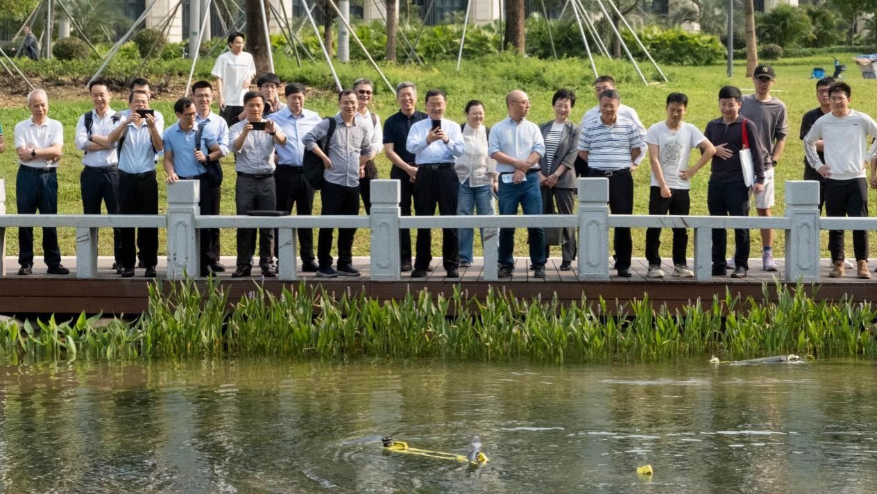 4月13日上午,高松校長(zhǎng)一行在深圳校區(qū)仙湖觀看航空航天學(xué)院縱列雙旋翼兩棲無(wú)人機(jī)演示。(黨委宣傳部 伍鈞浩 攝)
