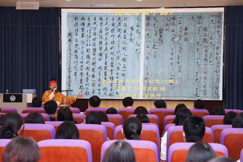 接著,徐戈老師作“千年唐風,踏樂而來”開幕講座。徐戈老師圍繞什么是唐樂、為什么要復原唐樂、怎么復原唐樂三個方面展開講授。他介紹了自己與團隊近年根據存世唐代樂器文物與文獻復原制作唐樂樂器,以及根據存世唐樂古樂譜、古舞譜,學術性復原唐代樂舞古曲的思路與過程,并分享了自己對于唐樂的認知和理念。最后,徐戈以樂器演奏的形式展示了復原組的研究成果,大唐之音,一曲千年,余音繞梁,為廣大師生帶來了一場視聽盛宴。