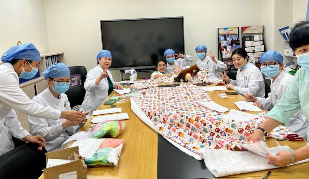 “童心妙妙屋”主要為12歲以下小朋友們的治療集中治療區域,為了減少輸液兒童的治療恐懼,醫護人員們還為小朋友們提供卡通輸液套和報警器,為兒童輸液安全保駕護航。小紅花輸液布袋用募集的較新衣物及卡通元素布料由活動中的志愿者們進行手工縫制,減少小朋友們對化療用藥的恐懼,更加輕松接受治療、配合治療。