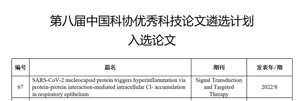 中大新聞網(wǎng)訊(通訊員張藝林)11月22日,中國科學(xué)技術(shù)協(xié)會(中國科協(xié))公布了第八屆優(yōu)秀科技論文遴選計(jì)劃入選論文。我校生命科學(xué)學(xué)院周文良/張藝林與鐘南山院士團(tuán)隊(duì)合作發(fā)表于自然出版集團(tuán)(NPG)旗下國際權(quán)威學(xué)術(shù)期刊《信號轉(zhuǎn)導(dǎo)與靶向治療(Signal Transduction and Targeted Therapy)》的封面論文“SARS-CoV-2 nucleocapsid protein triggers hyperinflammation via protein-protein interaction-mediated intracellular Cl? accumulation in respiratory epithelium”入選。