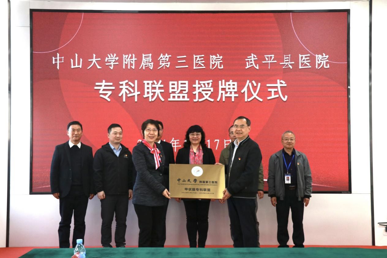 在舉辦義診活動的同時,附屬第三醫院黨委書記吳京洪以高質量黨建引領高質量發展為主題,從初心、凈心、同心、恒心、安心、凝心六個方面為武平縣醫院中層干部講授黨課,以黨建引領凝聚合力,精準對接深化對口合作。最后,附屬第三醫院為武平縣醫院甲狀腺專科聯盟授牌。