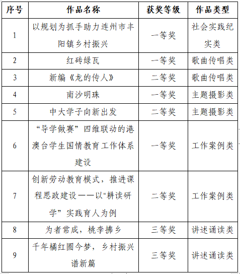 我校報送的《以規劃為抓手助力連州市豐陽鎮鄉村振興》等9項作品獲獎。其中,社會實踐紀實一等獎1項;歌曲傳唱類一等獎1項,二等獎1項;主題攝影類一等獎1項,二等獎1項;工作案例類一等獎1項,二等獎1項;講述誦讀類三等獎2項。