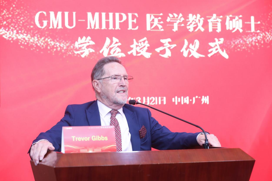 中山大學常務副校長、中山一院院長肖海鵬教授,中山大學校長助理、中山醫(yī)學院院長、中山一院副院長匡銘教授,中山醫(yī)學院黨委書記郝雅娟,中山醫(yī)學院醫(yī)學教育發(fā)展中心主任王庭槐教授,中山醫(yī)學院副院長王淑珍教授,AMEE前主席Trevor Gibbs教授,GMU校長Hossam Hamdy教授(線上)出席學位授予儀式,各臨床教研室代表、一線臨床教師代表、中山醫(yī)學院黨政部門負責人及骨干教師代表、中山一院相關職能部門代表參加典禮。