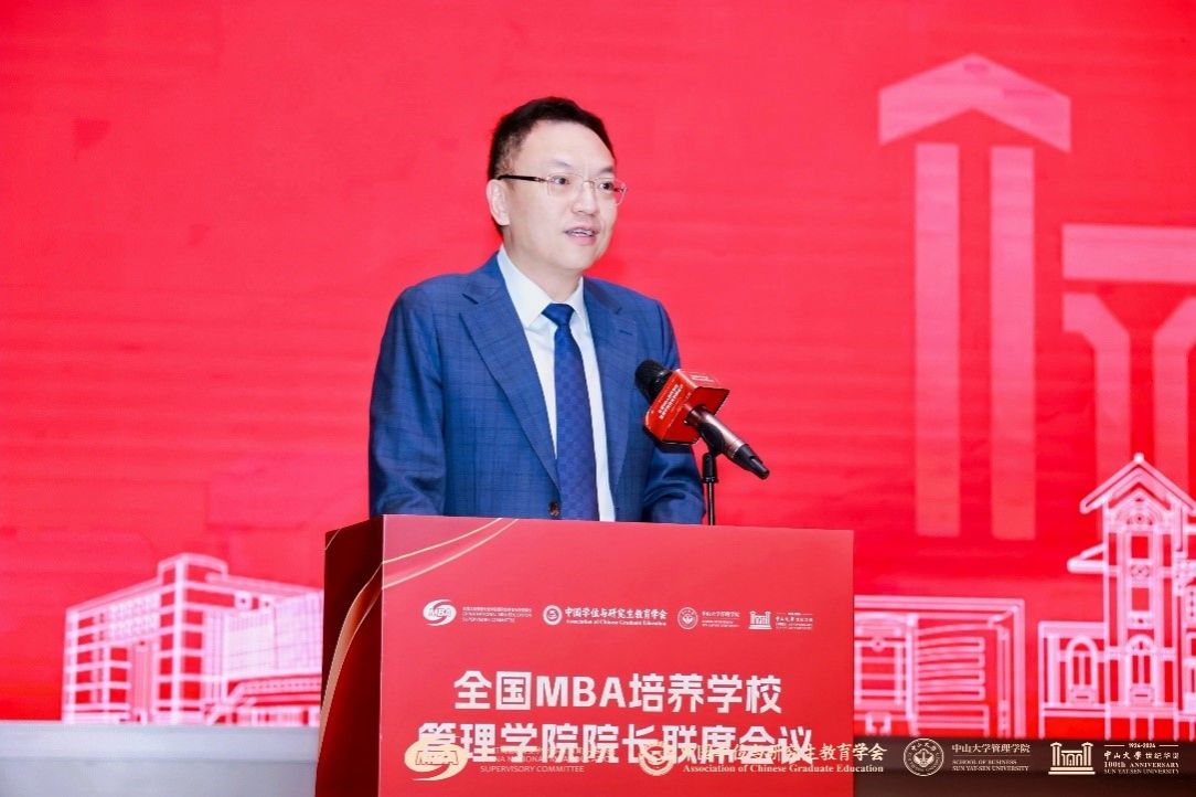 中山大學(xué)黨委副書記王帆致辭,他結(jié)合習(xí)近平總書記致中山大學(xué)建校100周年賀信精神,深刻總結(jié)了MBA教育未來發(fā)展的四個(gè)重要方向。他強(qiáng)調(diào),MBA教育要傳承紅色基因,培養(yǎng)具有堅(jiān)定理想信念和高度社會責(zé)任感的商業(yè)領(lǐng)袖;要為黨育人、為國育才,培育具備企業(yè)家精神的畢業(yè)生;要服務(wù)國家重大戰(zhàn)略和地方經(jīng)濟(jì)發(fā)展;要推進(jìn)教育改革,助力專業(yè)學(xué)位教育創(chuàng)新發(fā)展。