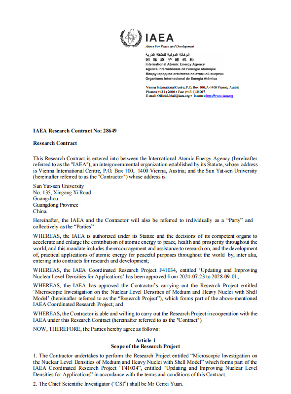 IAEA發起的協調研究計劃(Coordinated Research Project, CRP)旨在匯聚多國研究力量與資源,通過跨國協同攻關,加速解決全球核科學與核技術的關鍵共性問題。在今年發布的“面向應用的能級密度更新和優化”計劃中,IAEA面向成員國征集創新方案,以推動核數據質量與應用水平的全面提升。袁岑溪教授課題組依托近年來在微觀能級密度研究方面與中國核數據中心等單位的深度合作積累,提出了以核子-核子相互作用為基礎的新視角,以期精準描述中重核區能級密度的分布特征,深入揭示不同核力成分對能級密度的影響機制。該研究不僅有助于推動核數據理論的前沿突破,更將有力支持先進核能系統設計和核安全評估等領域的創新發展。
