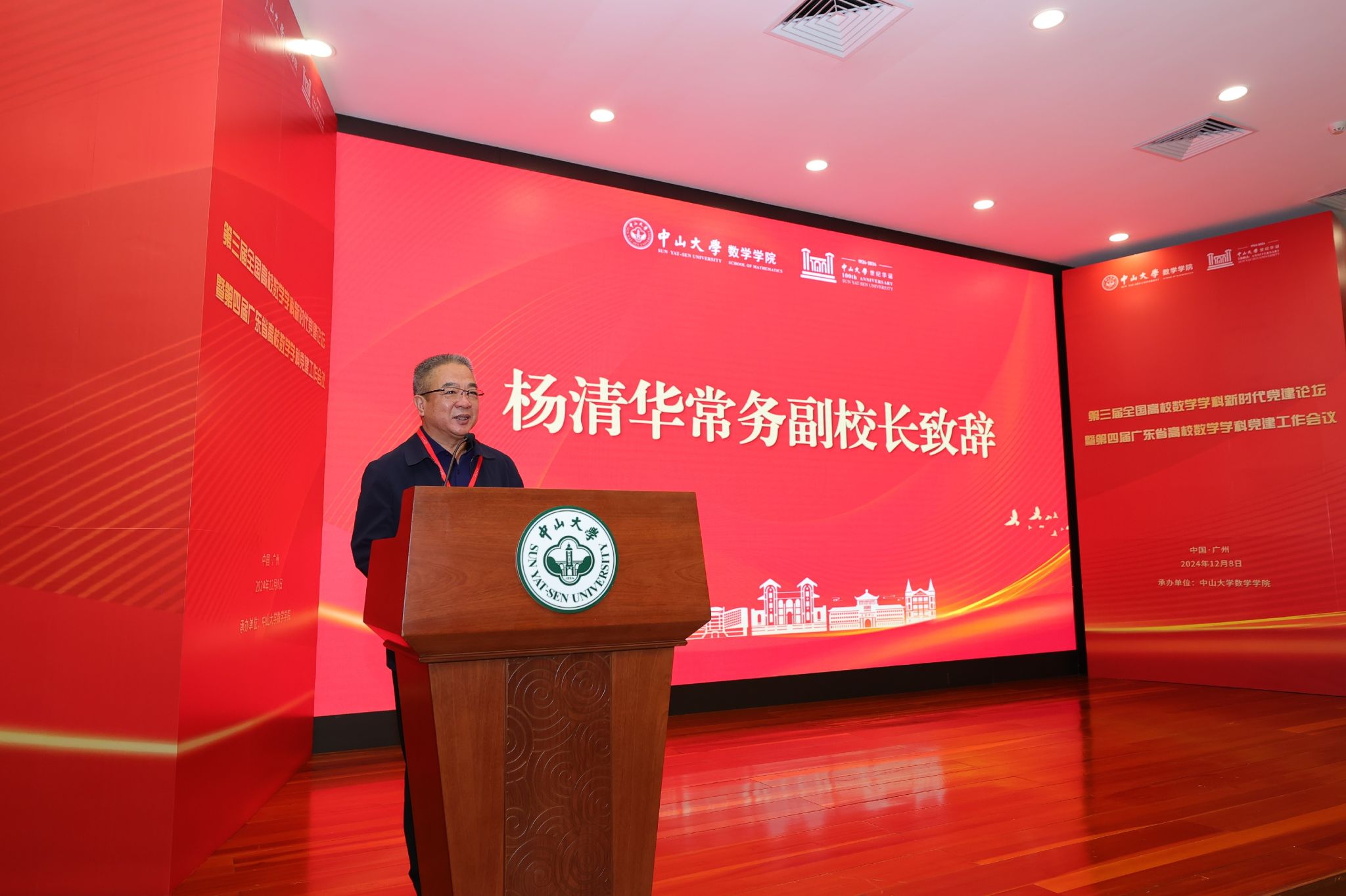 楊清華常務副校長在致辭中指出,本次會議正值中山大學建校100周年及中山大學數學學科建設百年,要深入學習貫徹習近平總書記致中山大學致中山大學建校100周年重要賀信精神,把習近平總書記賀信精神轉化為推動高校數學學科建設發展的強大動力。他指出,與會同志作為高校數學學科院系黨建“一線”的黨務工作者,要堅持黨建引領,堅持不懈用習近平新時代中國特色社會主義思想凝心鑄魂,以高質量的黨建工作引領和推動高質量的數學學科建設;作為高校院系育人“一線”的思政工作者,要傳承紅色基因,堅定不移落實立德樹人根本任務,引導數學青年學子矢志報國、服務人民,培養德智體美勞全面發展的社會主義建設者和接班人;作為高校院系科研工作的重要支持者和服務者,要聚焦“國之大者”,要把高校發展科技第一生產力、培養人才第一資源、增強創新第一動力更好結合起來,推動數學學科發揮基礎研究深厚、學科交叉融合的優勢,成為基礎研究的主力軍和重大科技突破的生力軍,圍繞國家重大戰略需求實現高水平科技自立自強,更好推動高校數學學科新時代黨建工作的高質量發展。
