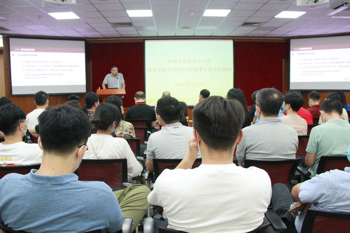 中大新聞網(wǎng)廣州6月16日電(通訊員黃奕楨)5月30日下午,嶺南學(xué)院在嶺南堂三樓講學(xué)廳召開全院教職工大會,傳達學(xué)習(xí)中山大學(xué)2022年春季工作會議精神。中山大學(xué)副校長兼嶺南學(xué)院院長李善民以及學(xué)院黨政班子成員、各黨支部書記、教研室主任、行政部主任等學(xué)院全體教職員工參加了會議。會議由學(xué)院黨委書記黃毅主持。