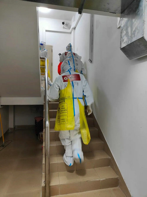 由于南校園實施“足不出戶”管理模式,隊員們需要“挨家挨戶”進行上門采樣。有的宿舍樓層最高有8層,在29℃的天氣下,隊員們穿著密不透風的防護服爬樓梯,汗流浹背,但大家心里想著師生平安健康,想著早點控制疫情,都毫無怨言。