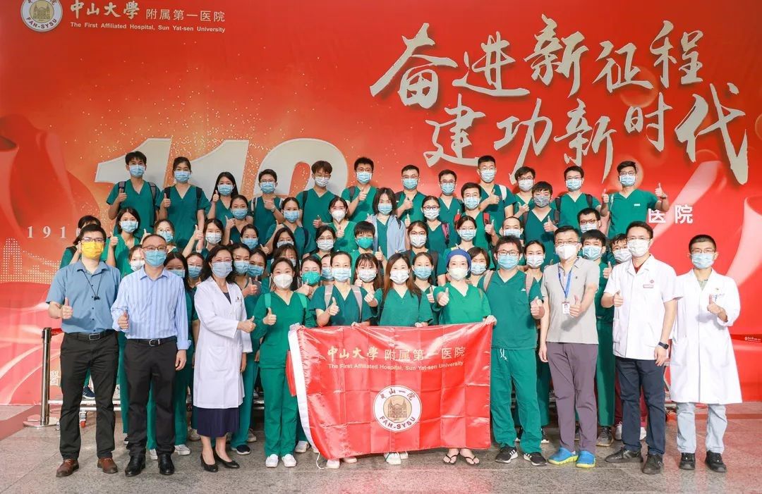 中山一院50人核酸采樣醫療隊整裝待發,趕赴中大南校園,醫務處劉大鉞處長、肖良成副處長參加出發儀式