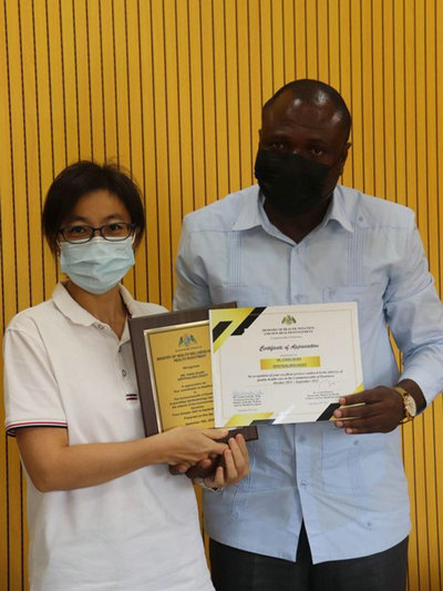 多米尼克衛生部秘書Edwards為段芳頒發嘉獎證書