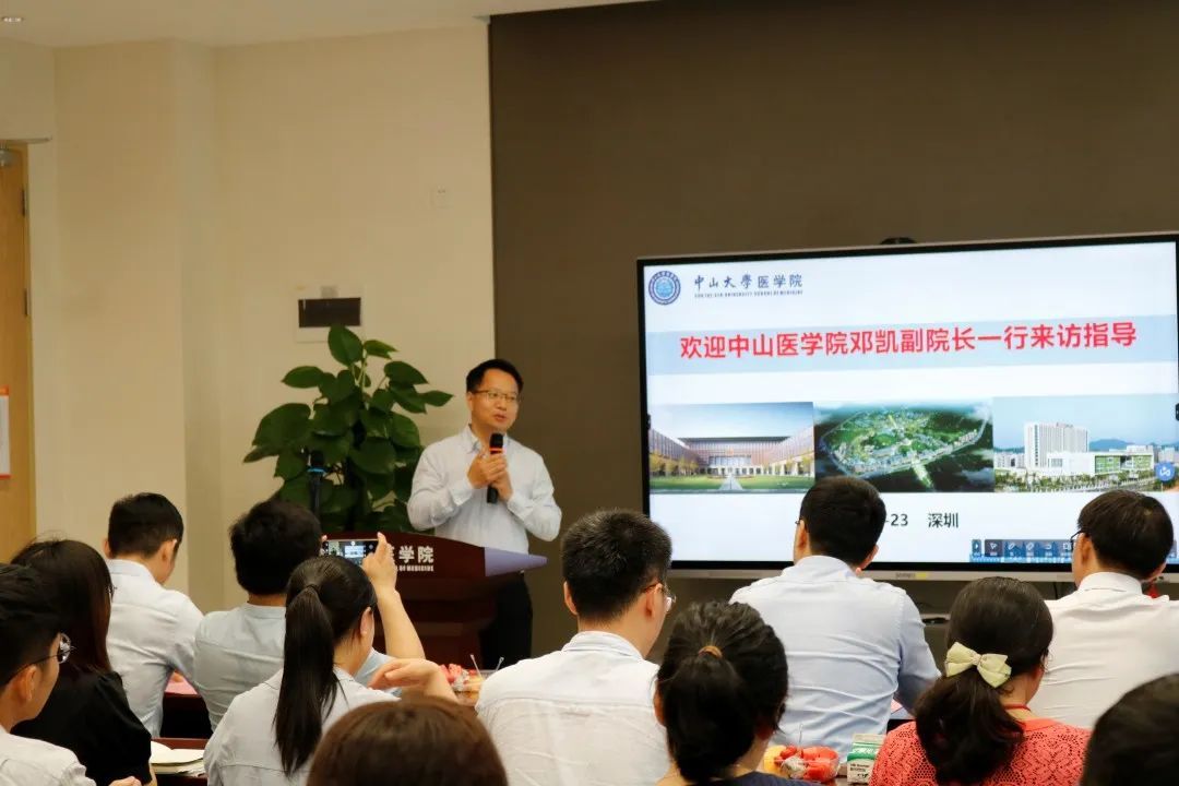 座談會(huì)上,田國(guó)寶教授首先歡迎中山醫(yī)學(xué)院一行來(lái)訪。丁小球書(shū)記代表醫(yī)學(xué)院感謝中山醫(yī)學(xué)院全體領(lǐng)導(dǎo)和老師長(zhǎng)期以來(lái)對(duì)醫(yī)學(xué)院的支持和幫助,感謝中山醫(yī)學(xué)院團(tuán)隊(duì)前來(lái)傳經(jīng)送寶。鄧凱教授分享了北校園科研平臺(tái)建設(shè)經(jīng)驗(yàn),并表示兩院將攜起手來(lái),加強(qiáng)未來(lái)各平臺(tái)之間的交流與合作。