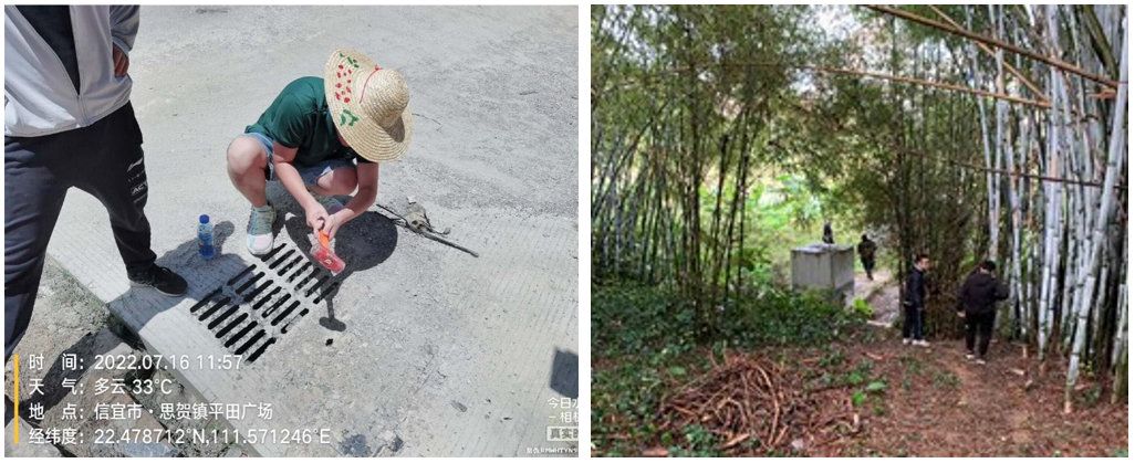 摸查管網(wǎng)問(wèn)題(左)、檢查井周圍環(huán)境情況(右)