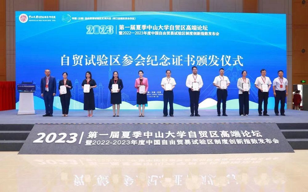 自貿試驗區參會紀念證書頒發儀式由董淳鍔副教授主持,他表示本次論壇是中山大學舉辦的首屆夏季自貿區高端論壇,與會嘉賓相約云南紅河,共襄盛會,不僅契合了中央對東西部協同發展的要求,更為沿邊自貿試驗區建設發展匯聚各方才智。為了表示對與會嘉賓的感謝, 符正平院長和河口縣委書記、 自貿試驗區紅河片區(河口邊合區)管委會黨工委副書記、管委會主任于洋為到場觀禮的來自上海臨港新片區、廣州南沙片區、深圳前海蛇口片區、天津自貿試驗區、 福建福州片區、福建廈門片區、遼寧大連片區、河南鄭州片區、重慶自貿試驗區、山東濟南片區、廣西崇左片區、云南昆明片區、云南德宏片區、云南紅河片區、黑龍江綏芬河片區、北京自貿試驗區、湖南長沙片區、安徽蕪湖片區、浙江寧波片區的自貿試驗區代表頒發紀念證書。