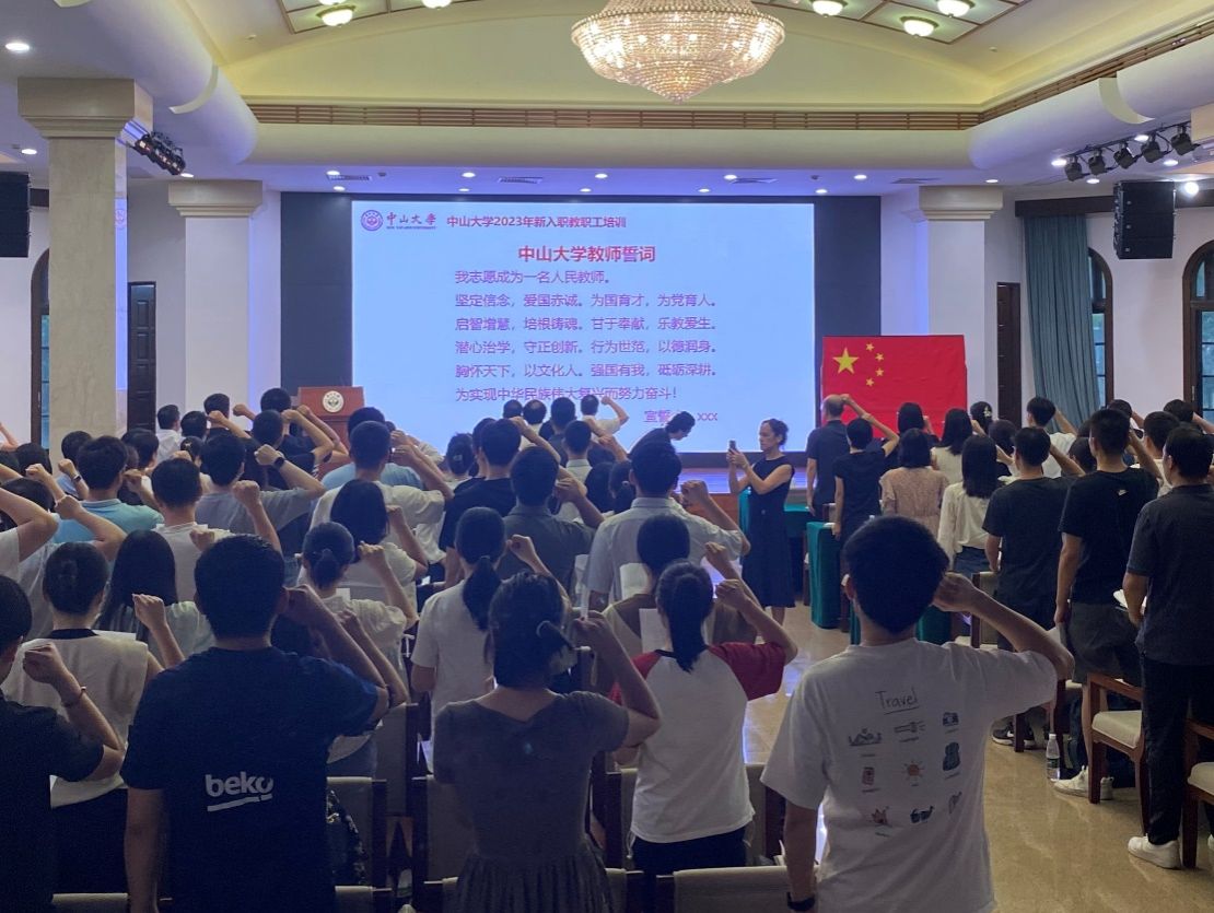 培訓(xùn)課程前,按照教育部、廣東省教育廳的通知要求,新入職教職工開展“教師宣誓”活動(dòng)。黨委教師工作部部長(zhǎng)馬明輝帶領(lǐng)全體新入職教職工面向國(guó)旗莊嚴(yán)宣誓,“我志愿成為一名教師。堅(jiān)定信念,愛國(guó)赤誠(chéng)……為實(shí)現(xiàn)中華民族偉大復(fù)興而努力奮斗!”鏗鏘的宣誓聲在會(huì)場(chǎng)中久久縈繞,“為黨育人,為國(guó)育才”的堅(jiān)定信念在新入職教職工心中落地生根。
