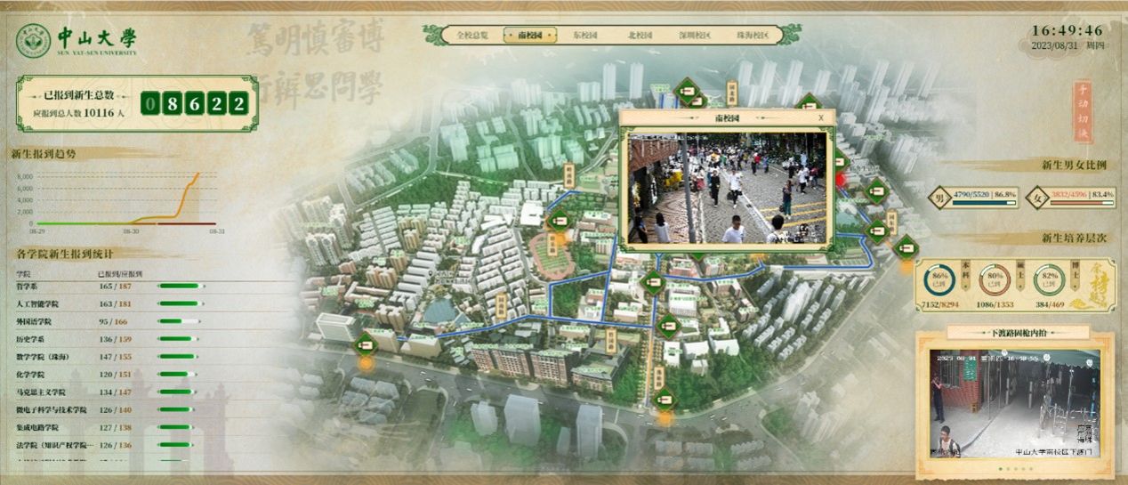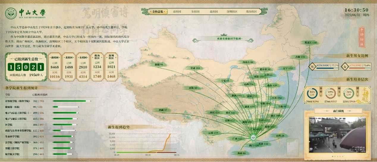 “新生已報到/應報到總數”“各個學院已報到/應報到排行榜”“新生男、女已報到/應報到比例”“新生培養層次已報到/應報到比例”等多維度的統計讓數據更加細化。新生報到期間的趨勢圖和地圖飛線形式的新生生源地圖,讓數據更加鮮活。除此之外,大屏還對接了“三校區五校園”多個迎新重要場所的實時視頻信號,能實時查看迎新現場的具體情況,讓數據更加直觀。值得一提的是,大屏對各校園新生活動的主要動線進行了熱力展示,人流密集的路段將會有黃點/紅點閃爍提示,讓數據更加可用。