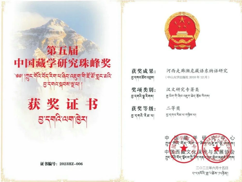 《河西走廊瀕危藏語東納話研究》獲獎證書