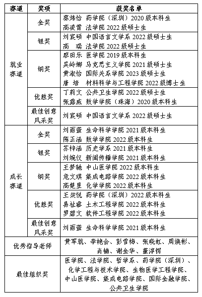經過激烈的角逐,大賽決出就業賽道和成長賽道金獎、銀獎、銅獎、優勝獎、最佳創意風采獎、優秀指導老師、最佳組織獎,并舉行了頒獎儀式。